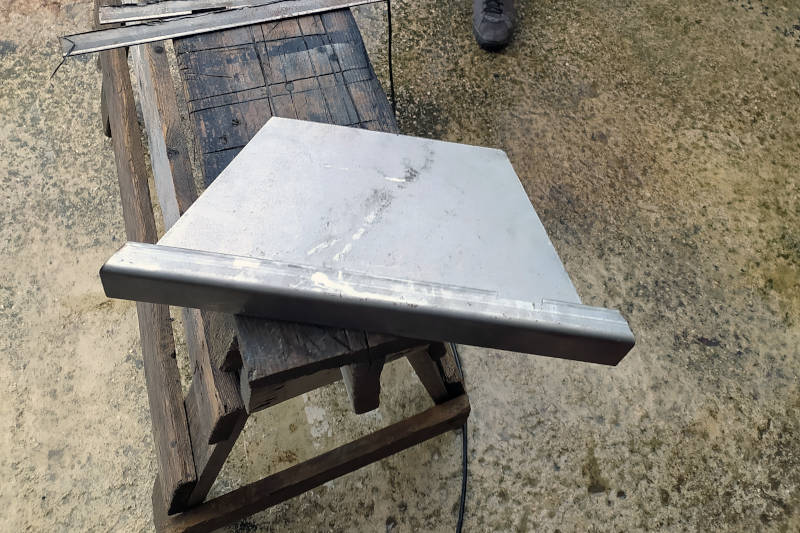 Questo carrello per saldatrice è realizzato recuperando parti di una porta blindata, sfruttando sapientemente il bordo in cui la spessa lamiera è ripiegata a 90°, per ricavare i quattro angolari montanti