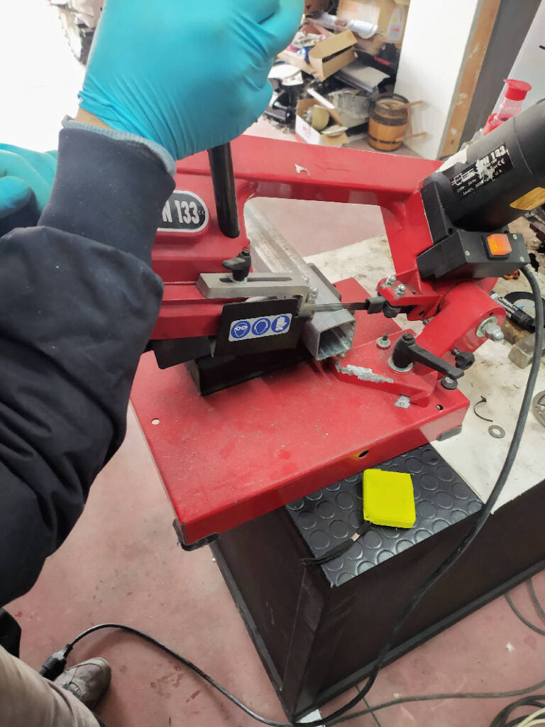 Invece di acquistare barre angolari per farne i montanti del carrello per saldatrice, si tagliano per un’estensione utile i bordi della porta, ricavando segmenti sufficientemente lunghi e robusti.