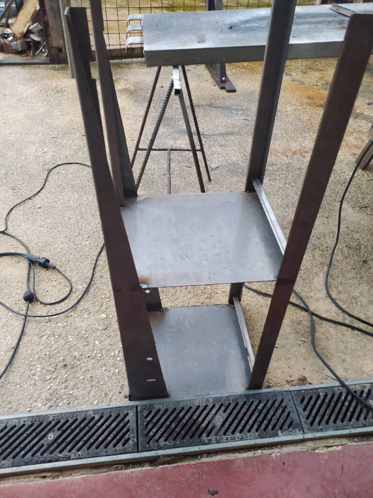 Il carrello, robusto e strutturato, è realizzato utilizzando ferro di recupero da una vecchia porta blindata, più altri avanzi e ferramenta accantonata. Le parti in lamiera piana servono per fare i ripiani, mentre per i montanti si utilizzano le parti risvoltate della porta, quelle sul contorno, tagliate secondo necessità.