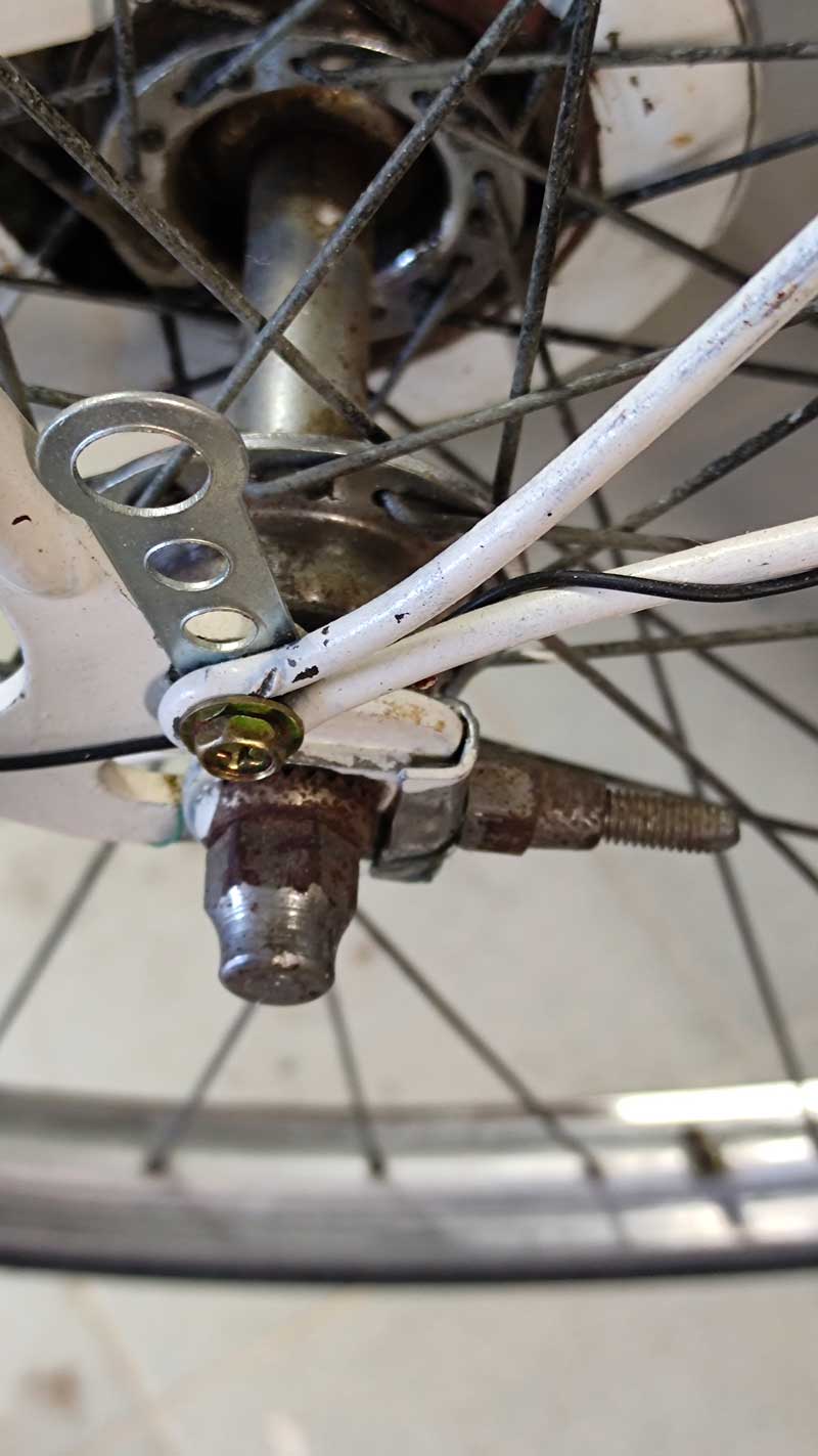 Prima di rimontare le ruote ho messo nuovi copertoni con fascia laterale bianca, in stile vintage. Ho installato nuovi pedali e pattini dei freni, scegliendo componenti compatibili dal design classico, per mantenere l’estetica originale. Infine, ho riposizionato il paragonna originale in plastica, posto tra il mozzo posteriore e il parafango: nonostante gli anni, era ancora integro e ha richiesto solo una pulizia accurata per rimuovere sporco e grasso accumulato.