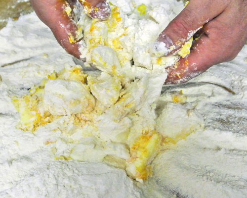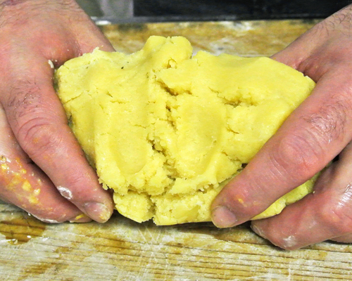 5. Man mano che l’impasto si forma, recuperiamo la farina che rimane sul piano fino ad assorbimento completo; continuiamo a manipolarlo fino ad ottenere una massa omogenea.