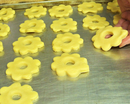2. Con lo stampino iniziamo a formare i canestrelli abbastanza ravvicinati, in modo da sfruttare al meglio la sfoglia. le strisce che rimangono vanno nuovamente amalgamate per poi ottenere una seconda sfoglia e ripetere l’operazione, fino ad aver utilizzato completamente l’impasto.