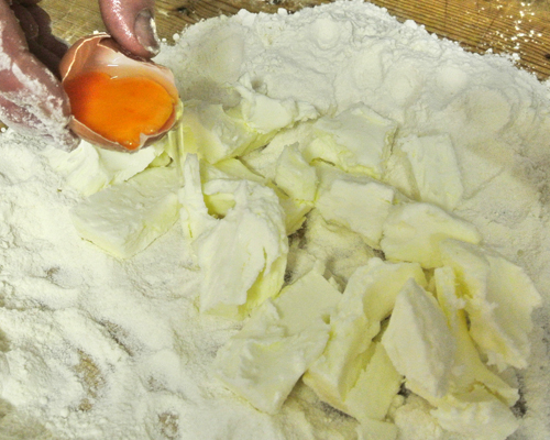 3. Prima di iniziare a impastare aggiungiamo anche gli altri ingredienti: i rossi d’uovo e lo zucchero.