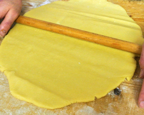 1. Allarghiamo il pane ottenuto dapprima con le mani, poi con l’aiuto di un mattarello: dobbiamo ottenere una sfoglia uniforme che sia spessa circa mezzo centimetro.