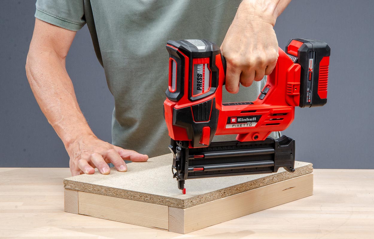 Alimentata con batterie al litio 18 V della famiglia Einhell Power X-Change, Einhell Fixetto spara chiodi con una lunghezza da 15 a 50 mm, sezione 1,2 mm, a colpo singolo oppure a ripetizione in condizioni di contatto con la superficie