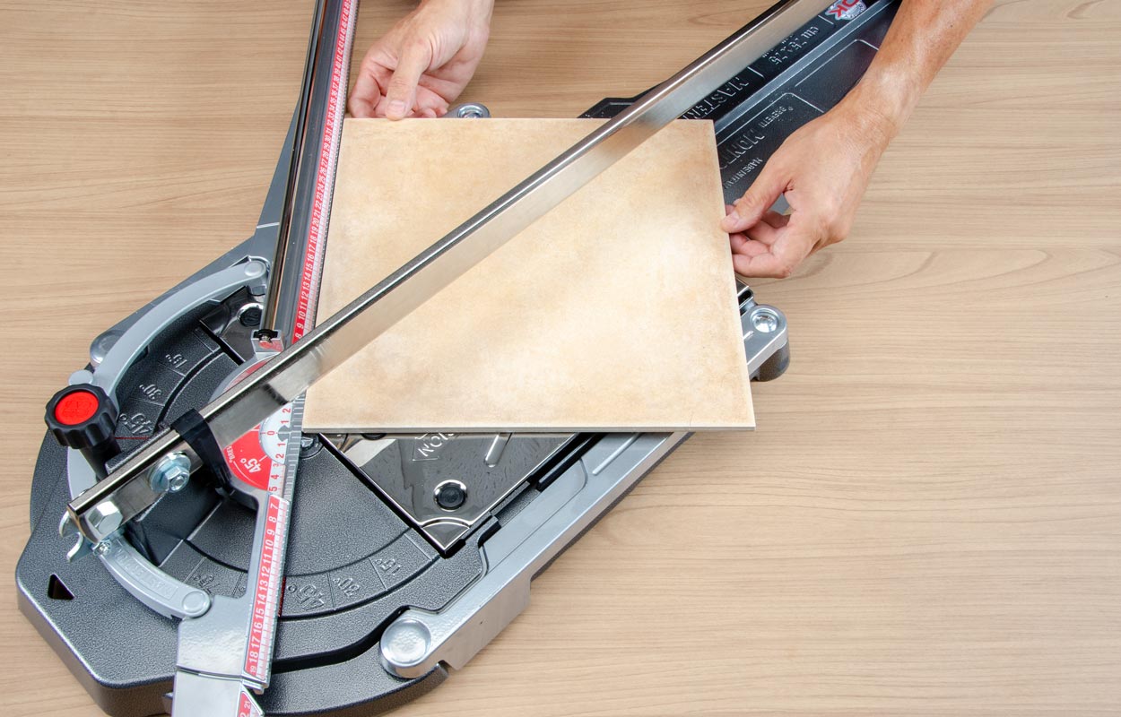 Nuovo anche il doppio sistema di spacco che permette di sezionare senza alcun problema strisce strettissime di piastrella e, lavorando a 45°, consente di ottenere triangoli di piccolissime dimensioni. La rotella in titanio taglia indifferentemente materiali spessi e materici oppure sottili piastrelle di vetro, anche in mosaico. Poi le due ali di supporto che si aprono di 180°, lo scontro laterale che è ribaltabile pur mantenendo la misura impostata e, non ultima, la rapidità con cui la macchina diviene pronta all’uso: in pochi secondi si imposta la squadra a 0°, 45° oppure valori intermedi, anche fuorisquadra sull’altro lato, e si procede col taglio.