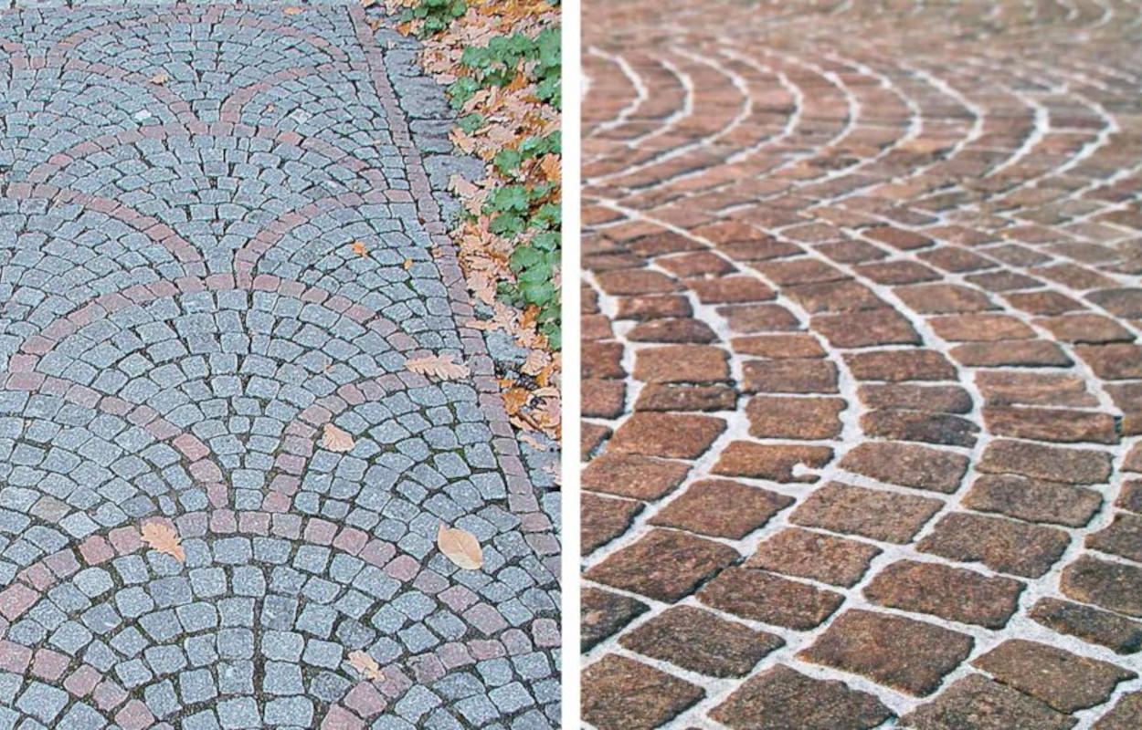 La versatilità dei cubetti di porfido permette diverse geometrie di posa: ad archi contrastanti, a file parallele, a coda di pavone, a cerchi concentrici ecc.