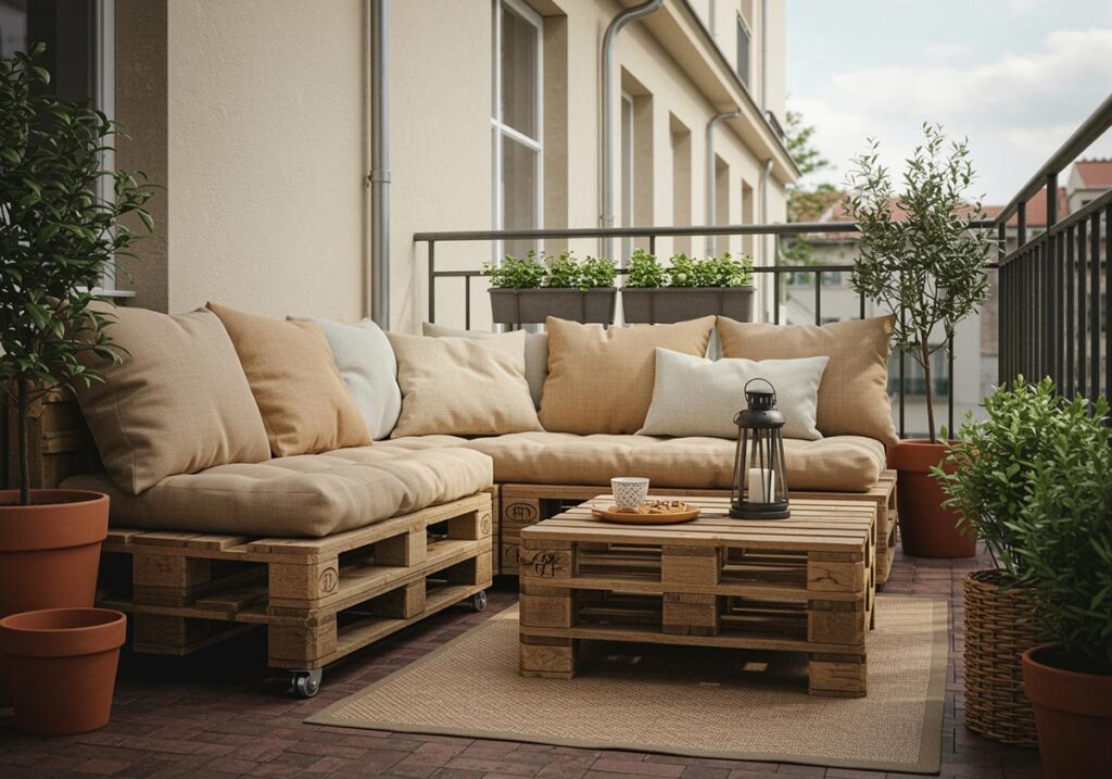 La configurazione a “L” più comune prevede cinque pallet per la seduta e quattro in verticale come schienale, per un ingombro complessivo di circa 240×160 cm — misura che richiede una terrazza di almeno 12-14 mq per non risultare opprimente. Per spazi più piccoli, una seduta lineare con due pallet affiancati e uno schienale singolo funziona bene anche su un balcone di medie dimensioni, specie se si aggiungono rotelle bloccabili sotto la base per spostare l’insieme con facilità quando serve pulire o rientrare i cuscini.