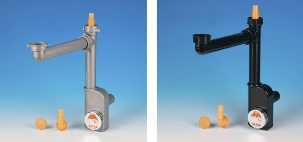 Oltre al classico bianco, il sifone Spazio 1NT Evolution è disponibile anche grigio metallizzato e nero, offrendo una possibile opzione di personalizzazione, consentendo il migliore adattamento cromatico allo stile della cucina moderna.