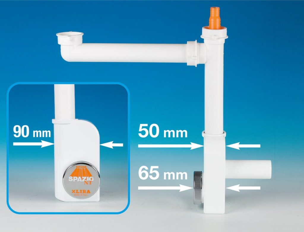 Il nuovo design, caratterizzato da una forma disassata rispetto all’asse frontale, consente al sifone di adattarsi e compensare eventuali irregolarità durante l’installazione, offrendo una soluzione versatile e adattabile a varie configurazioni. Con una larghezza massima di 90 mm, profondità di 50 mm e 65 mm in corrispondenza del tappo, il corpo del Sifone Spazio 1NT Evolution ha misure esterne ulteriormente ridotte rispetto a Spazio NT, pur risultando altrettanto efficace sotto il profilo della velocità di smaltimento dell’acqua scaricata.