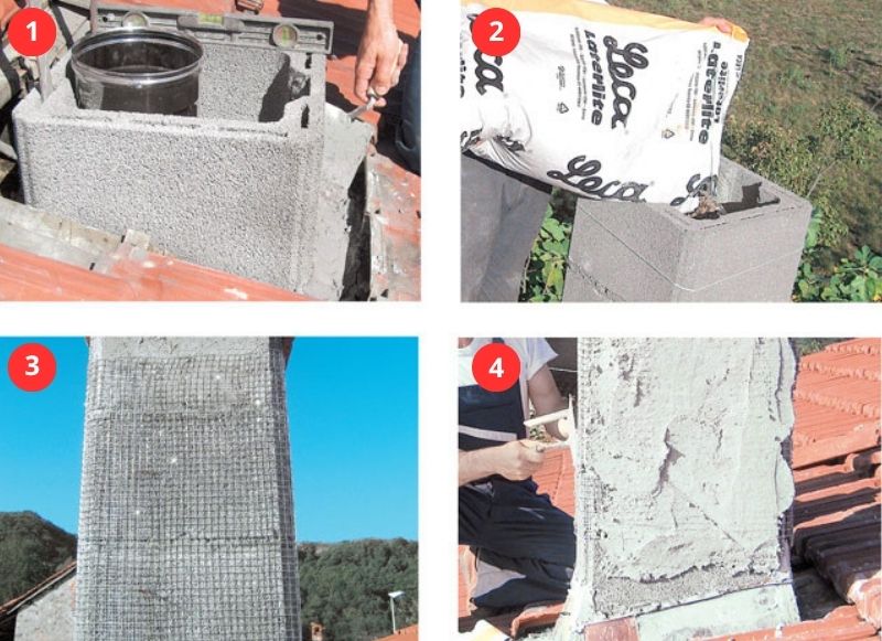 2 – Riempiamo l’intercapedine tra i blocchetti e i tubi della canna fumaria con argilla espansa Leca per assicurare un buon isolamento. Proteggiamo l’imboccatura della canna tappandola accuratamente.