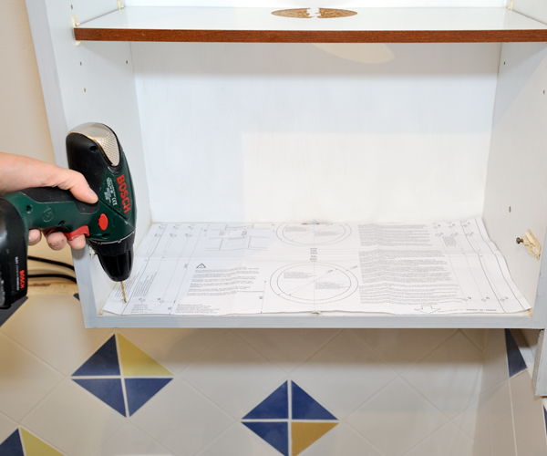 2. Aperto il foro di aspirazione con una sega a tazza di diametro adeguato, possiamo avvitare la cappa alla base del pensile per poi collegare elettricamente la ventola e la luce di servizio.