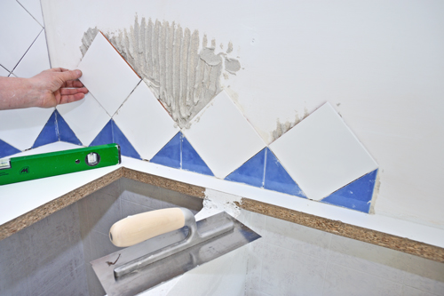 2. L’incollaggio inizia da uno degli angoli, quello maggiormente in vista, a filo del top; collochiamo una coppia di triangoli colorati e proseguiamo, prima sui lati e poi a salire, posizionando intercalate le piastrelle intere bianche e i triangoli blu, applicando poca colla per volta dato che indurisce velocemente.