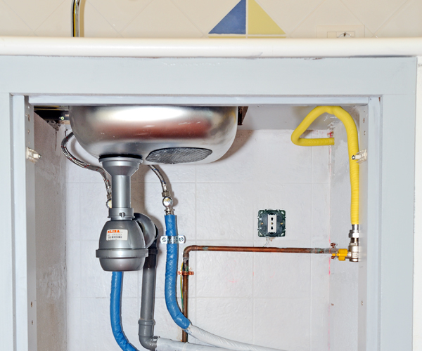 5. A questo punto possiamo montare il gruppo miscelatore completo di flessibili e la piletta di scarico (anche se, per maggiore praticità, lo si potrebbe fare prima di montare il lavello in sede), completando poi il collegamento al sifone e alle tubazioni di mandata.