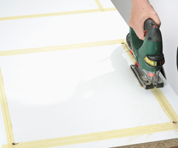 1. Il piano cucina è il classico pannello di laminato già pronto, di spessore compreso tra 30 e 60 mm, con il bordo frontale stondato, più largo di 60-80 mm per poterlo incassare nelle pareti laterali. Utilizzando le dime a corredo di lavello e piano cottura delimitiamo la linea di taglio con nastro per mascheratura, su cui eseguiamo la tracciatura; con il trapano pratichiamo i 4 fori d’ingresso per la lama del seghetto in corrispondenza degli angoli.